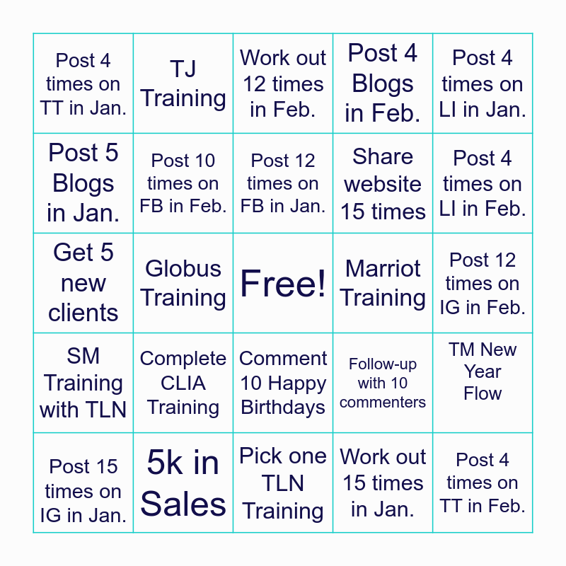 This bingo card has a free space and 24 words: Complete CLIA Training, 5k in Sales, Post 12 times on FB in Jan., Post 15 times on IG in Jan., Post 4 times on LI in Jan., Post 4 times on TT in Jan., Post 5 Blogs in Jan., TJ Training, Marriot Training, Comment 10 Happy Birthdays, Share website 15 times, Get 5 new clients, Follow-up with 10 commenters, TM New Year Flow, Post 10 times on FB in Feb., Work out 15 times in Jan., Post 12 times on IG in Feb., Work out 12 times in Feb., Post 4 times on LI in Feb., Globus Training, Post 4 times on TT in Feb., SM Training with TLN, Post 4 Blogs in Feb. and Pick one TLN Training.
