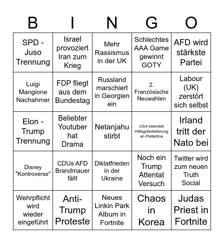 This bingo card has a free space and 24 words: CDUs AFD Brandmauer fällt, Anti-Trump Proteste, Russland marschiert in Georgien ein, Wehrpflicht wird wieder eingeführt, AFD wird stärkste Partei, SPD - Juso Trennung, Luigi Mangione Nachahmer, Israel provoziert Iran zum Krieg, USA beendet Hilfsgüterlieferung an Palästina, Diktatfrieden in der Ukraine, 2. Französische Neuwahlen, Elon - Trump Trennung, Noch ein Trump Attentat Versuch, Twitter wird zum neuen Truth Social, FDP fliegt aus dem Bundestag, Chaos in Korea, Irland tritt der Nato bei, Mehr Rassismus in der UK, Labour (UK) zerstört sich selbst, Beliebter Youtuber hat Drama, Judas Priest in Fortnite, Disney "Kontroverse", Schlechtes AAA Game gewinnt GOTY and Neues Linkin Park Album in Fortnite.