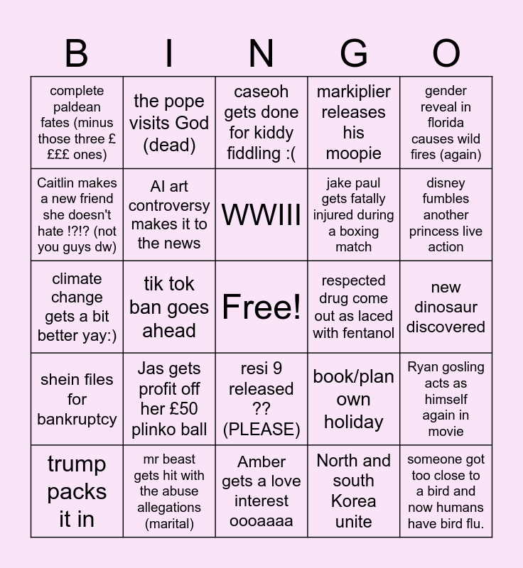 This bingo card has a free space and 24 words: trump packs it in, Jas gets profit off her £50 plinko ball, WWIII, North and south Korea unite, gender reveal in florida causes wild fires (again), complete paldean fates (minus those three ££££ ones), the pope visits God (dead), caseoh gets done for kiddy fiddling :(, respected drug come out as laced with fentanol, new dinosaur discovered, climate change gets a bit better yay:), AI art controversy makes it to the news, book/plan own holiday, Ryan gosling acts as himself again in movie, Caitlin makes a new friend she doesn't hate !?!? (not you guys dw), mr beast gets hit with the abuse allegations (marital), Amber gets a love interest oooaaaa, markiplier releases his moopie, disney fumbles another princess live action, shein files for bankruptcy, tik tok ban goes ahead, resi 9 released ?? (PLEASE), jake paul gets fatally injured during a boxing match and someone got too close to a bird and now humans have bird flu..