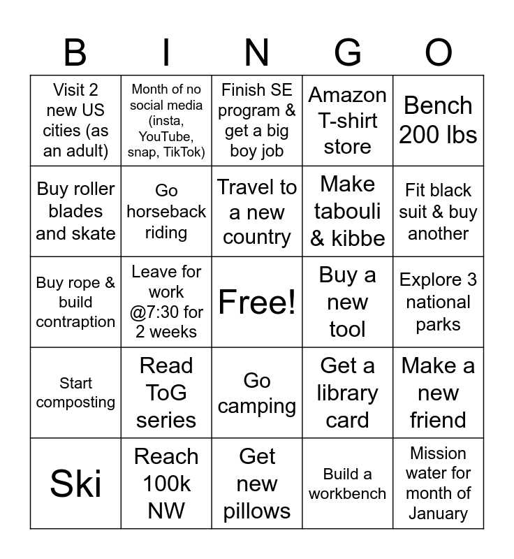 This bingo card has a free space and 24 words: Read ToG series, Reach 100k NW, Travel to a new country, Ski, Bench 200 lbs, Visit 2 new US cities (as an adult), Buy roller blades and skate, Month of no social media (insta, YouTube, snap, TikTok), Buy a new tool, Go camping, Make tabouli & kibbe, Buy rope & build contraption, Get a library card, Make a new friend, Go horseback riding, Build a workbench, Explore 3 national parks, Finish SE program & get a big boy job, Fit black suit & buy another, Leave for work @7:30 for 2 weeks, Mission water for month of January, Start composting, Amazon T-shirt store and Get new pillows.