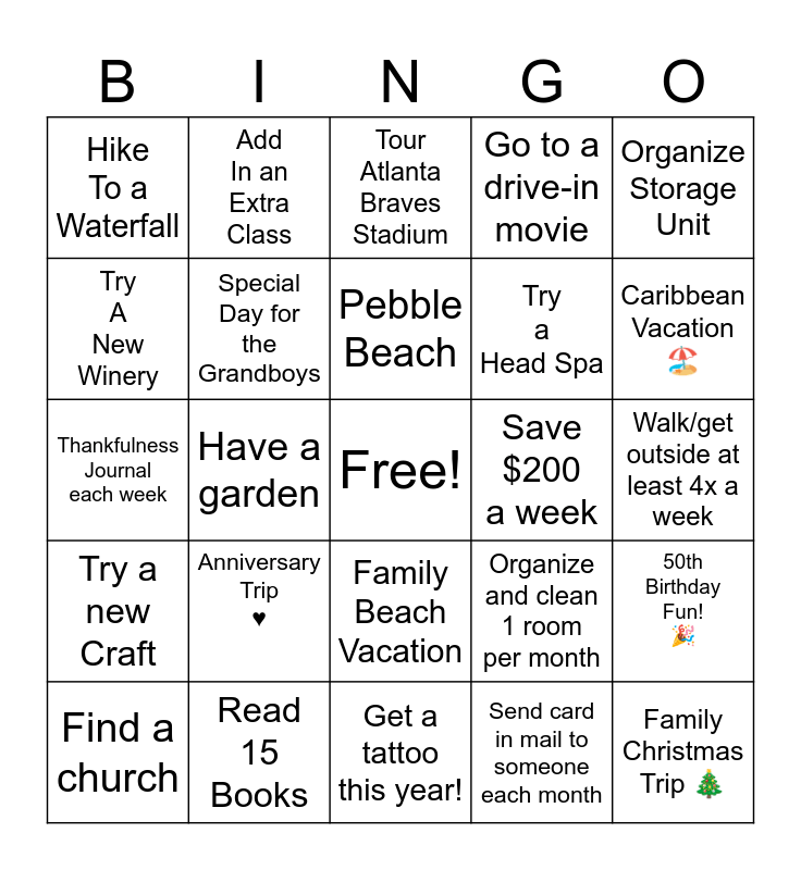 This bingo card has a free space and 24 words: Anniversary Trip ♥️, Read 15 Books, Pebble Beach, Find a church, Organize Storage Unit, Hike To a Waterfall, Try A New Winery, Add In an Extra Class, Save $200 a week, Family Beach Vacation, Try a Head Spa, Thankfulness Journal each week, Organize and clean 1 room per month, 50th Birthday Fun! 🎉, Special Day for the Grandboys, Send card in mail to someone each month, Walk/get outside at least 4x a week, Tour Atlanta Braves Stadium, Caribbean Vacation 🏖️, Have a garden, Family Christmas Trip 🎄, Try a new Craft, Go to a drive-in movie and Get a tattoo this year!.