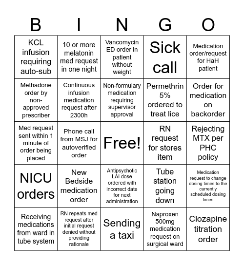 This bingo card has a free space and 37 words: Pharmacy Happy Hour (i.e any EtOH order/med request), STAT medication request for multivitamin, Medication request for a POM, Continuous infusion medication request after 2300h, Medication request to change dosing times to the currently scheduled dosing times, New Bedside medication order, Non-formulary medication requiring supervisor approval, RN calls for medication and finds supply while still on the phone, Medication order/request for HaH patient, Medication order for patient with anaphylactic latex allergy, Phone call from MSJ for autoverified order, Sick call, Clozapine titration order, Rejecting MTX per PHC policy, Methadone order by non-approved prescriber, NICU orders, Receiving POM for identification without prompting, Vancomycin ED order in patient without weight, Antipsychotic LAI dose ordered with incorrect date for next administration, RN request for stores item, KCL infusion requiring auto-sub, Order for medication on backorder, Receiving medications from ward in tube system, Sending a taxi, IV order in non-standard diluent, Naproxen 500mg medication request on surgical ward, 10 or more melatonin med request in one night, Any COVID order/med request (i.e dexamethasone 6mg, remdesivir, paxlovid...), Any pharmacist working overtime, Completing a Pass med, Receiving fridge temperature alert, RN repeats med request after initial request denied without providing rationale, Med request sent within 1 minute of order being placed, Verifying/adjusting antibiotic infusion rate to be over 3hrs for critical care, Tube station going down, Permethrin 5% ordered to treat lice and New compound order.