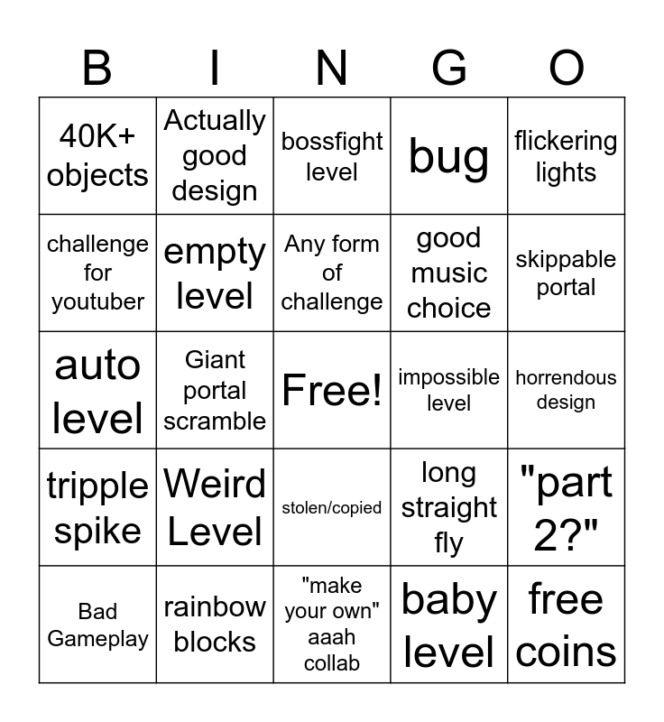 This bingo card has a free space and 24 words: Bad Gameplay, Weird Level, Any form of challenge, baby level, flickering lights, 40K+ objects, Actually good design, bossfight level, impossible level, horrendous design, auto level, empty level, long straight fly, "part 2?", challenge for youtuber, rainbow blocks, "make your own" aaah collab, bug, skippable portal, tripple spike, Giant portal scramble, stolen/copied, good music choice and free coins.