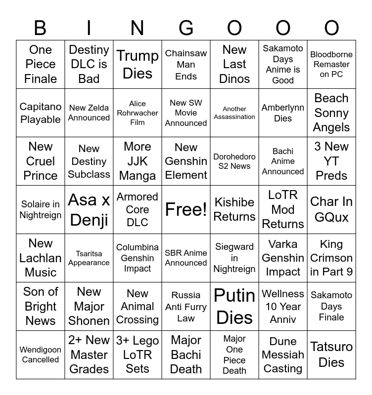This bingo card has a free space and 48 words: Putin Dies, Amberlynn Dies, Major Bachi Death, Asa x Denji, More JJK Manga, Char In GQux, Destiny DLC is Bad, 2+ New Master Grades, Sakamoto Days Anime is Good, SBR Anime Announced, Bloodborne Remaster on PC, Chainsaw Man Ends, Bachi Anime Announced, Dorohedoro S2 News, Son of Bright News, LoTR Mod Returns, Capitano Playable, Beach Sonny Angels, Wellness 10 Year Anniv, New Last Dinos, Another Assassination, Armored Core DLC, One Piece Finale, New Zelda Announced, Sakamoto Days Finale, Alice Rohrwacher Film, 3 New YT Preds, Wendigoon Cancelled, New Genshin Element, New Destiny Subclass, Dune Messiah Casting, Kishibe Returns, King Crimson in Part 9, New Major Shonen, Solaire in Nightreign, Siegward in Nightreign, Varka Genshin Impact, New Cruel Prince, Columbina Genshin Impact, New Animal Crossing, New Lachlan Music, Tatsuro Dies, Trump Dies, 3+ Lego LoTR Sets, New SW Movie Announced, Russia Anti Furry Law, Tsaritsa Appearance and Major One Piece Death.