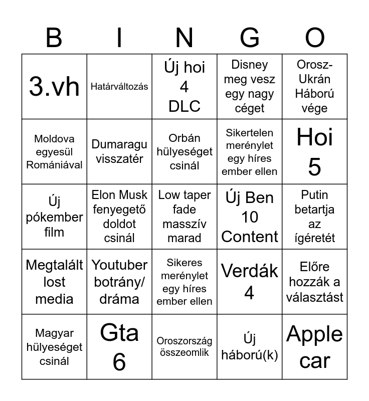 This bingo card has a free space and 24 words: Youtuber botrány/ dráma, Gta 6, Orbán hülyeséget csinál, Magyar hülyeséget csinál, Orosz- Ukrán Háború vége, 3.vh, Moldova egyesül Romániával, Határváltozás, Új Ben 10 Content, Sikeres merénylet egy híres ember ellen, Sikertelen merénylet egy híres ember ellen, Új pókember film, Verdák 4, Előre hozzák a választást, Dumaragu visszatér, Új háború(k), Putin betartja az ígéretét, Új hoi 4 DLC, Hoi 5, Elon Musk fenyegető doldot csinál, Apple car, Megtalált lost media, Disney meg vesz egy nagy céget and Oroszország összeomlik.