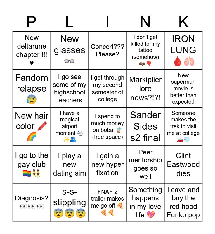 This bingo card has a free space and 24 words: I play a new dating sim, s-s-stipplingπ¨π¨π¨, I get through my second semester of college, Diagnosis?πππ, IRON LUNG π©Έπ«, New deltarune chapter !!!β₯οΈ, Fandom relapse π°, New glasses π, Sander Sides s2 final, I gain a new hyper fixation, Markiplier lore news?!?!, New hair color ποΈπ, Peer mentorship goes so well, Clint Eastwood dies, I go see some of my highschool teachers, Something happens in my love life π, Someone makes the trek to visit me at college ππ¨, Concert??? Please?, New superman movie is better than expected, I have a magical airport moment π¬β¨π«, I cave and buy the red hood Funko pop, I go to the gay club π³οΈβππ―ββοΈ, I don't get killed for my tattoo (somehow)π¦π and FNAF 2 trailer makes me go off πππ.