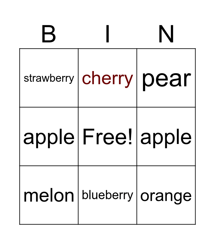 This bingo card has a free space and 8 words: apple, pear, cherry, melon, strawberry, orange, apple and blueberry.