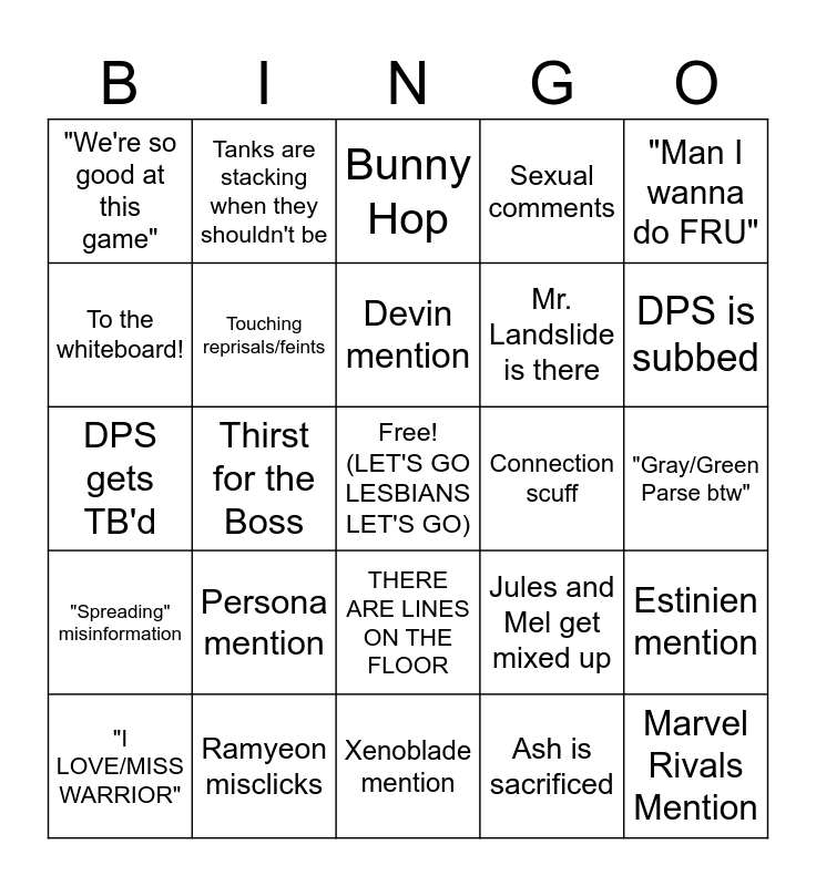 This bingo card has a free space and 28 words: Estinien mention, P8S mention, Mr. Landslide is there, Ash is sacrificed, To the whiteboard!, Bunny Hop, Tanks are stacking when they shouldn't be, "Spreading" misinformation, Connection scuff, "I LOVE/MISS WARRIOR", DPS gets TB'd, Sexual comments, Ramyeon misclicks, Xenoblade mention, DPS is subbed, Jules survives thanks to white privilege, Persona mention, Touching reprisals/feints, Devin mention, THERE ARE LINES ON THE FLOOR, "We're so good at this game", Retainer finished a venture, Marvel Rivals Mention, Thirst for the Boss, "Gray/Green Parse btw", Jules and Mel get mixed up, "Man I wanna do FRU" and "If we DPS hard enough...".