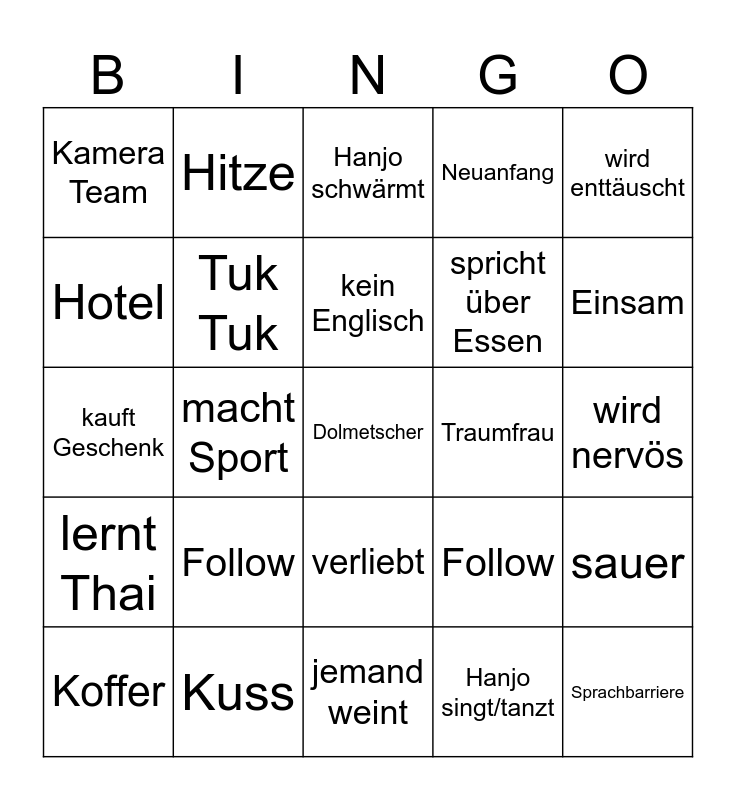This bingo card has 25 words: Follow, jemand weint, kein Englisch, Koffer, wird enttäuscht, Kamera Team, Hotel, Hitze, Traumfrau, verliebt, spricht über Essen, kauft Geschenk, Follow, sauer, Tuk Tuk, Sprachbarriere, wird nervös, Hanjo schwärmt, Einsam, macht Sport, Dolmetscher, Kuss, lernt Thai, Neuanfang and Hanjo singt/tanzt.