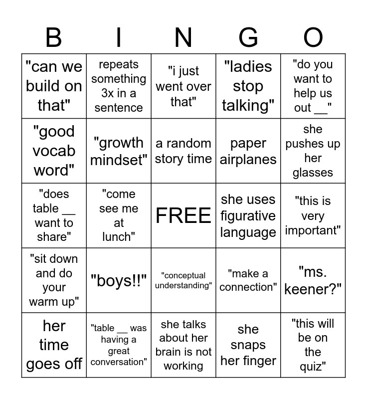 This bingo card has a free space and 26 words: "conceptual understanding", she snaps her finger, a random story time, "table __ was having a great conversation", "do you want to help us out __", "can we build on that", "good vocab word", repeats something 3x in a sentence, "this is very important", "make a connection", paper airplanes, "does table __ want to share", "ms. keener?", her time goes off, "come see me at lunch", "im sorry", "ladies stop talking", "sit down and do your warm up", "i just went over that", "this will be on the quiz", she pushes up her glasses, she talks about her brain is not working, she uses figurative language, "boys!!", "growth mindset" and mentions it being a magnet class.