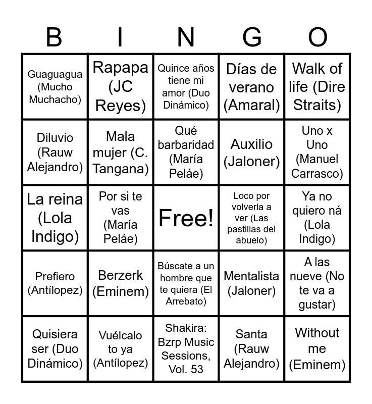 This bingo card has a free space and 113 words: Penas con rumba (Estopa), Vino Tinto (Estopa), El burrito Sabanero (David Bisbal), Como camarón (Estopa), Tu calorro (Estopa), Vaciones (Estopa), Días de verano (Amaral), Marta, Sebas, Guille y los demás (Amaral), Como un burro amarrado a la puerta del baile (El último de la fila), Lápiz y tinta (El último de la fila), Corazón contento (Marisol), Estando contigo (Marisol), Tanto la quería (Andy & Lucas), Son de amores (Andy & Lucas), Y en tu ventana (Andy & Lucas), Gente Luminosa (El Arrebato), Búscate a un hombre que te quiera (El Arrebato), Mirala cara a cara (Requiebros), El probe Miguel (Requiebros), Amor de verano (Duo Dinámico), Quisiera ser (Duo Dinámico), Quince años tiene mi amor (Duo Dinámico), Canela en rama (El Kanka), Qué bello es vivir (El Kanka), Lo mal que estoy (y lo poco que quejo) (El Kanka), Prefiero (Antílopez), Vuélcalo to ya (Antílopez), Musa en paro busca poeta (Antílopez), Salitre (Manuel Carrasco), Qué bonito es querer (Manuel Carrasco), Uno x Uno (Manuel Carrasco), Qué barbaridad (María Peláe), Por si te vas (María Peláe), La Putikita (María Peláe), Movezz en silencio (Cruz Cafuné), Ojitos aguaos (Cruz Cafuné), Lo pues intentar (Cruz Cafuné), Cuando despertó (Kaze), La lloradita (Kaze), Ringui Dingui (Kase O ft. SFDK), Mazas y catapultas (Kase O), El cielo (Kaze ft. HardGZ), Renacimiento (Kase. O), Que me lleve el aire (Luis Cortés), En sueños (Luis Cortés), Sin ti, Sin mi (Luis Cortés), Santa (Rauw Alejandro), Diluvio (Rauw Alejandro), Cosa nuestra (Rauw Alejandro), Welcome (Nikone), Mi revolución (Cuatro pesos de propina), Loco por volverla a ver (Las pastillas del abuelo), Un poco de amor francés (Patricio rey y sus redonditos de Ricota), Spaghetti del Rock (Divididos), Me gustas mucho (Viejas locas), Mil horas (Los abuelos de la nada), La bomba loca (Gustavo Cordera), Nos siguen pegando abajo (Charly García), Crimen (Gustavo Cerati), De música ligera (Soda Stereo), A las nueve (No te va a gustar), Ese maldito momento (No te va a gustar), Sin miedo a vivir (SFDK), Yo contra todos (SFDK), Espacio vital (SFDK, Sho-Hai, Kase,O), Ingobernable (C. Tangana), Tu me dejaste de querer (C. Tangana), Mala mujer (C. Tangana), La reina (Lola Indigo), Mujer bruja (Lola Indiga), Ya no quiero ná (Lola Indigo), La marina sta morena (Figa Flawas), Que no s'acabi (Figa flawas), Solucions i no problemes (Figa Flawas), The Real Slim Shady (Eminem), Without me (Eminem), Berzerk (Eminem), Guaguagua (Mucho Muchacho), Mucho beef (Mucho Muchazo), Aquí te pillo aquí temazo (Mucho Muchacho), Badgyal (Saiko ft. JC Reyes), Rapapa (JC Reyes), Goteras (Omar Montes, JC Reyes), Mentalista (Jaloner), Auxilio (Jaloner), Vull estar amb tu (Els catarres), Jenifer (Els catarres), En peu de guerra (Els catarres), Quiéreme (El Barrio), Orgullo (El Barrio), Pa' Madrid (El barrio), Sultans of swing (Dire Straits), Walk of life (Dire Straits), Money for nothing (Dire Straits), Don't Stop Me Now (Queen), Under Pressure (Queen), Bohemian Rhapsody (Queen), Me equivocaría otra vez (Fito & Fitipaldis), Antes de que cuente diez (Fito & Fitipaldis), La casa por el tejado (Fito & Fitipaldis), Soldadito Marinero (Fito & Fitipaldis), Tu jardín con enanitos (Melendi), Caminando por la vida (Melendi), Desde que estamos juntos (Melendi), Hablando en plata (Melendi), Soltera (Shakira), Shakira: Bzrp Music Sessions, Vol. 53, Las babys (Aitana), Mon amor (Aitana, Zoilo), La_Original.mp3 (Tini, Emilia), Miénteme (Tiene, Maria Becerra), 7 rings (Ariana Grande) and Side to Side (Ariana Grande, Niki minaj).