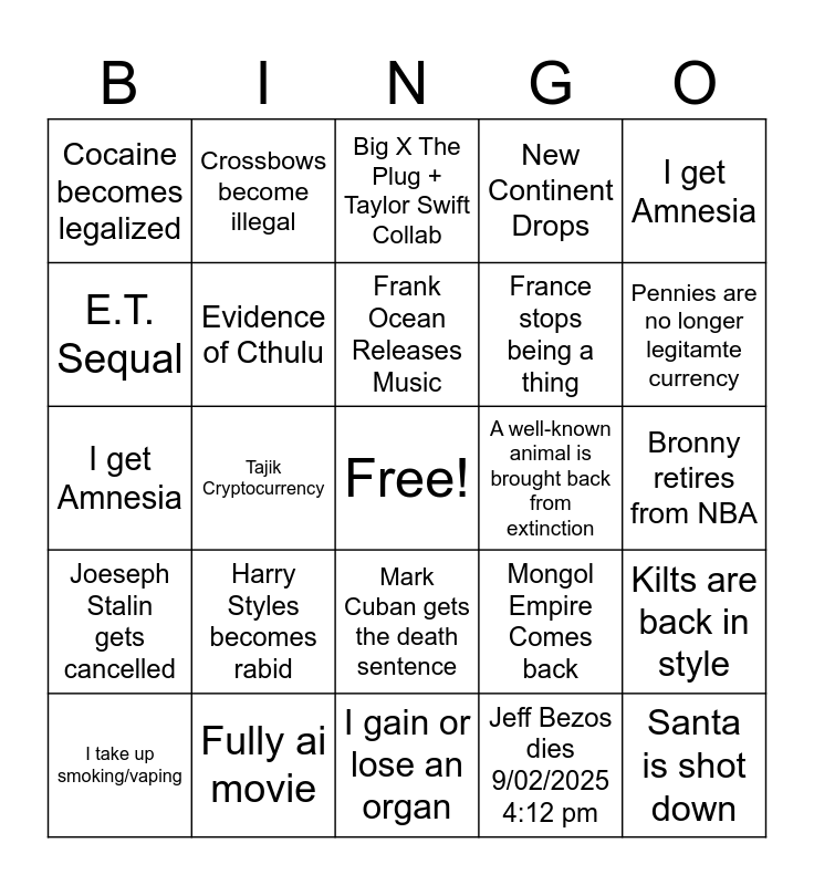 This bingo card has a free space and 24 words: Harry Styles becomes rabid, Fully ai movie, Frank Ocean Releases Music, I take up smoking/vaping, I get Amnesia, Cocaine becomes legalized, E.T. Sequal, Crossbows become illegal, A well-known animal is brought back from extinction, Mark Cuban gets the death sentence, France stops being a thing, I get Amnesia, Mongol Empire Comes back, Kilts are back in style, Evidence of Cthulu, Jeff Bezos dies 9/02/2025 4:12 pm, Bronny retires from NBA, Big X The Plug + Taylor Swift Collab, Pennies are no longer legitamte currency, Tajik Cryptocurrency, Santa is shot down, Joeseph Stalin gets cancelled, New Continent Drops and I gain or lose an organ.