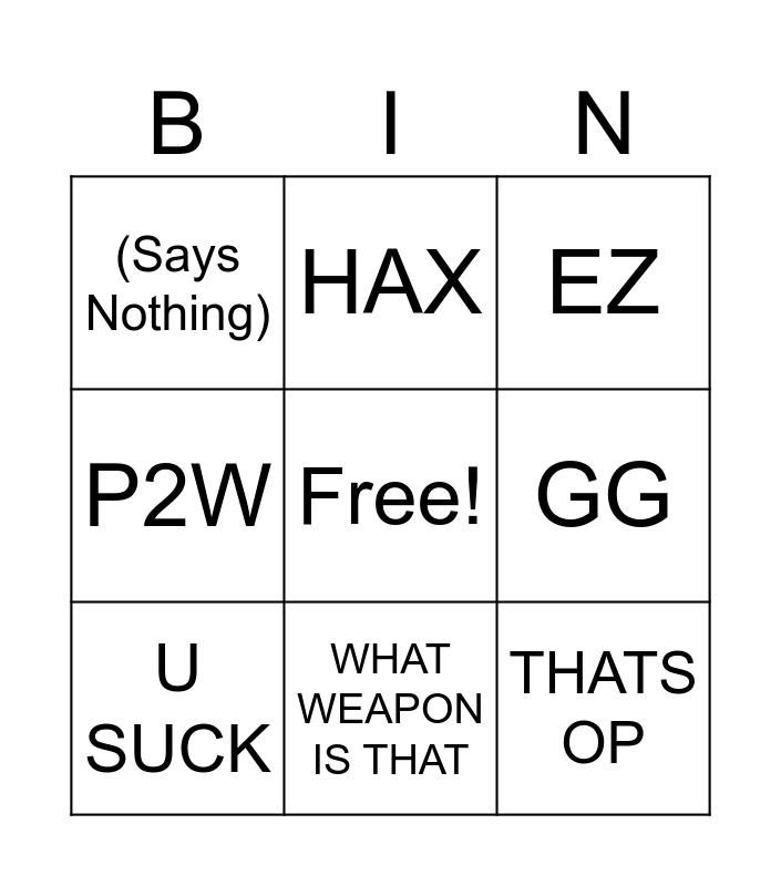 This bingo card has a free space and 8 words: GG, EZ, HAX, U SUCK, (Says Nothing), THATS OP, P2W and WHAT WEAPON IS THAT.