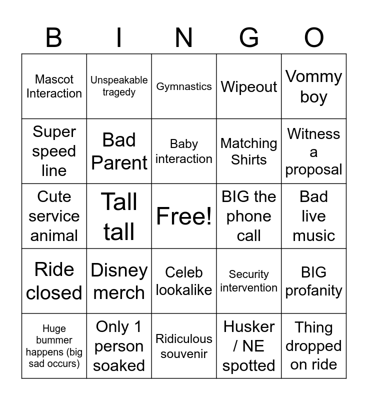 This bingo card has a free space and 61 words: Meet someone who is from Nebraska fan of huskers, Only 1 person soaked, Ride malfunction, Ride closed, Husker / NE spotted, A meal bad, Bad Parent, Hagrid incident, Matching Shirts, BIG spill, Wipeout, See Lizard, Super speed line, Crazy thing heard, Funny kid, Mascot Interaction, Thing dropped on ride, Vommy boy, Cool ground thing, Baby interaction, BIG the phone call, Gymnastics, Huge bummer happens (big sad occurs), BIG profanity, $7.50, ET say it weird, Lost shoe, Surprise! Cheap!, Witness a proposal, Recognize someone twice, Ry gets a migraine, Sunburn, Crazy haircut, Famous person, Unspeakable tragedy, Fancy man, Human kindness, Tall tall, Incoherent person (smile nod), Cute service animal, Weird posession, Disney merch, Bad live music, Really drunk person, Security intervention, Ugly baby, Taylor swift song, Wand fail, Ruin cherished memory, Celeb lookalike, Ridiculous souvenir, Technology fail, Sanitation fail, Hold thing picture, Hot topic hogwarts, SUPER fan, Parent hype speech, Lots tattoo, Body builder (baby bonus), Devices listening and Rude human.