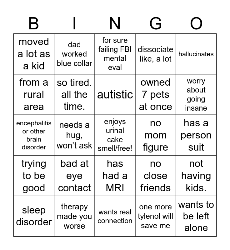 This bingo card has a free space and 24 words: bad at eye contact, therapy made you worse, autistic, sleep disorder, hallucinates, moved a lot as a kid, from a rural area, dad worked blue collar, no mom figure, has had a MRI, owned 7 pets at once, encephalitis or other brain disorder, no close friends, not having kids., so tired. all the time., one more tylenol will save me, has a person suit, for sure failing FBI mental eval, worry about going insane, needs a hug, won’t ask, wants to be left alone, trying to be good, dissociate like, a lot and wants real connection.