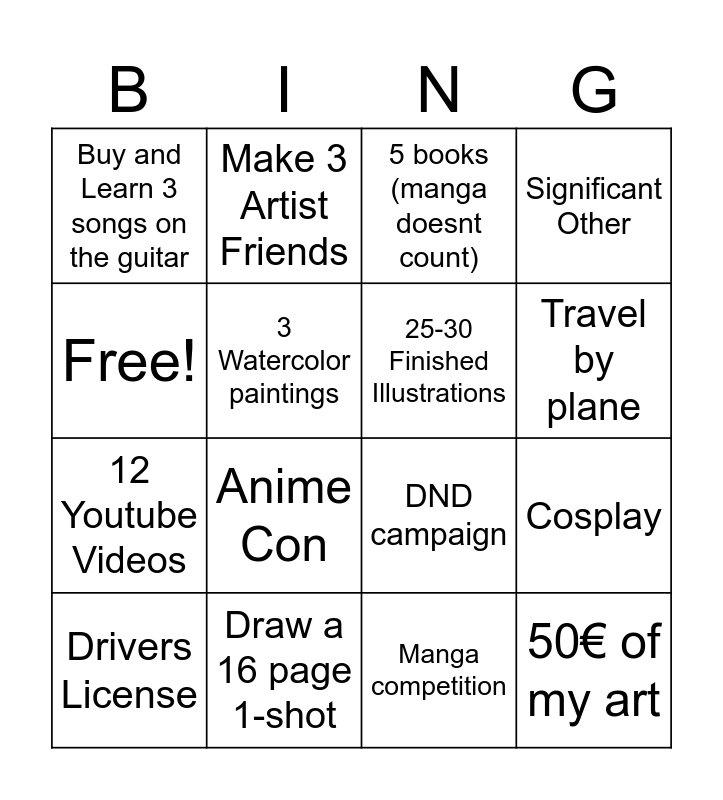 This bingo card has 16 words: Draw a 16 page 1-shot, Cosplay, 5 books (manga doesnt count), Buy and Learn 3 songs on the guitar, 12 Youtube Videos, Make 3 Artist Friends, DND campaign, Manga competition, Free!, 3 Watercolor paintings, Drivers License, Significant Other, Anime Con, Travel by plane, 25-30 Finished Illustrations and 50€ of my art.