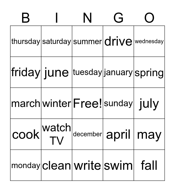 This bingo card has a free space and 25 words: watch TV, write, tuesday, monday, wednesday, thursday, friday, saturday, sunday, december, january, march, april, may, june, october, july, summer, spring, winter, fall, clean, cook, drive and swim.