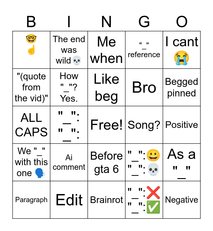 This bingo card has a free space and 24 words: Ai comment, Edit, Like beg, Paragraph, I cant 😭, 🤓☝️, "(quote from the vid)", The end was wild💀, Song?, Before gta 6, Bro, ALL CAPS, "_":😀 "_":💀, As a "_", How "_"? Yes., "_":❌ "_":✅, Positive, Me when, Begged pinned, "_": "_":, Negative, We "_" with this one 🗣️, "_" reference and Brainrot.