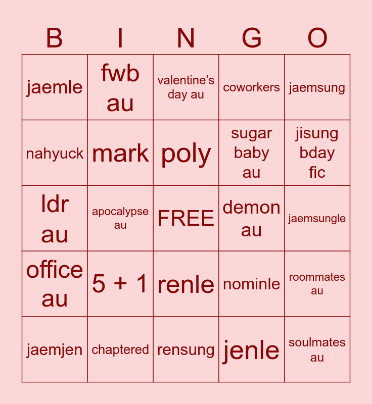 This bingo card has a free space and 24 words: 5 + 1, chaptered, poly, jaemjen, jaemsung, jaemle, nahyuck, fwb au, demon au, renle, sugar baby au, ldr au, nominle, roommates au, mark, jenle, jaemsungle, valentine’s day au, jisung bday fic, apocalypse au, soulmates au, office au, coworkers and rensung.
