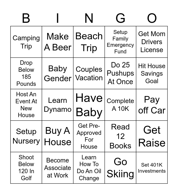 This bingo card has a free space and 24 words: Buy A House, Become Associate at Work, Couples Vacation, Shoot Below 120 In Golf, Get Mom Drivers License, Camping Trip, Drop Below 185 Pounds, Make A Beer, Complete A 10K, Get Pre-Approved For House, Do 25 Pushups At Once, Host An Event At New House, Read 12 Books, Get Raise, Baby Gender, Go Skiing, Pay off Car, Beach Trip, Hit House Savings Goal, Learn Dynamo, Set 401K Investments, Setup Nursery, Setup Family Emergency Fund and Learn How To Do An Oil Change.