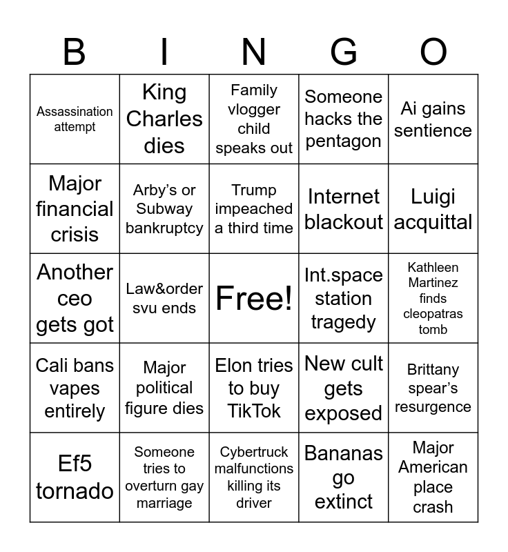 This bingo card has a free space and 24 words: Major political figure dies, Someone tries to overturn gay marriage, Trump impeached a third time, Ef5 tornado, Ai gains sentience, Assassination attempt, Major financial crisis, King Charles dies, Int.space station tragedy, Elon tries to buy TikTok, Internet blackout, Another ceo gets got, New cult gets exposed, Brittany spear’s resurgence, Arby’s or Subway bankruptcy, Bananas go extinct, Kathleen Martinez finds cleopatras tomb, Family vlogger child speaks out, Luigi acquittal, Law&order svu ends, Major American place crash, Cali bans vapes entirely, Someone hacks the pentagon and Cybertruck malfunctions killing its driver.