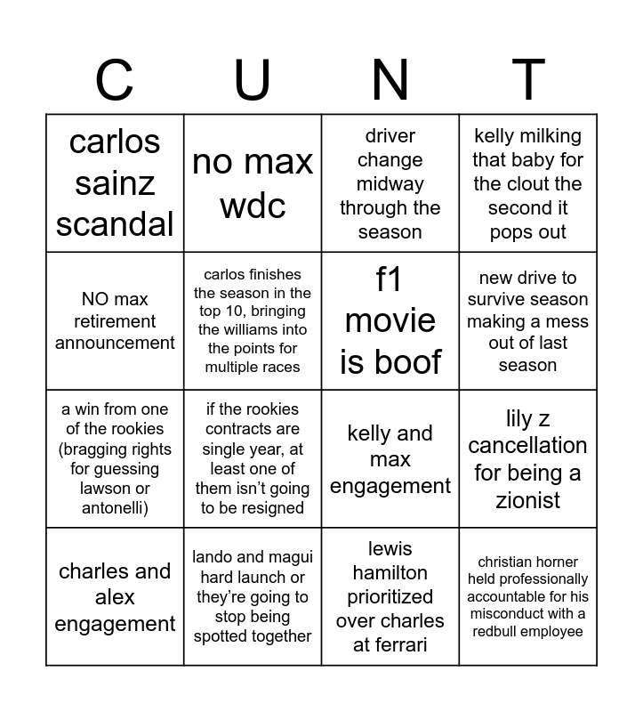 This bingo card has 16 words: charles and alex engagement, lando and magui hard launch or they’re going to stop being spotted together, driver change midway through the season, kelly milking that baby for the clout the second it pops out, NO max retirement announcement, no max wdc, kelly and max engagement, lily z cancellation for being a zionist, carlos sainz scandal, carlos finishes the season in the top 10, bringing the williams into the points for multiple races, lewis hamilton prioritized over charles at ferrari, new drive to survive season making a mess out of last season, a win from one of the rookies (bragging rights for guessing lawson or antonelli), if the rookies contracts are single year, at least one of them isn’t going to be resigned, f1 movie is boof and christian horner held professionally accountable for his misconduct with a redbull employee.