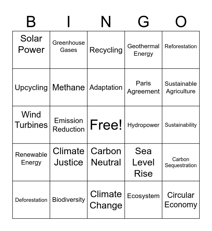 This bingo card has a free space and 34 words: Zero Waste, Ecosystem, Clean Technology, Conservation, Renewable Energy, Methane, Reforestation, Deforestation, Greenhouse Gases, Mitigation, Adaptation, Recycling, Eco-Friendly, Carbon Footprint, Hydropower, Sustainable Agriculture, Biodiversity, Wind Turbines, Climate Justice, Sea Level Rise, Carbon Neutral, Global Warming, Solar Power, Sustainability, Climate Change, Circular Economy, Geothermal Energy, Fossil Fuels, Paris Agreement, Upcycling, Composting, Emission Reduction, Carbon Sequestration and Green Investment.