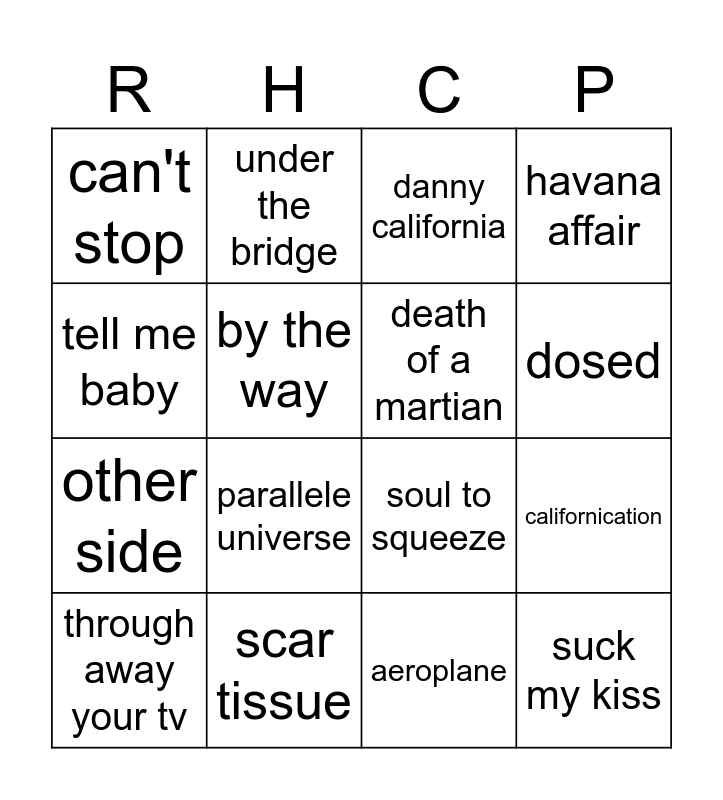 This bingo card has 16 words: scar tissue, californication, danny california, can't stop, other side, under the bridge, soul to squeeze, aeroplane, tell me baby, by the way, through away your tv, havana affair, parallele universe, dosed, death of a martian and suck my kiss.