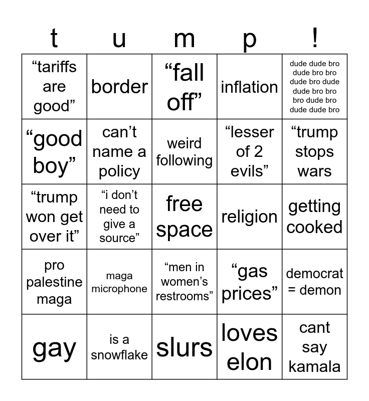 This bingo card has a free space and 84 words: “its just my opinion”, “stop interrupting”, “fall off”, “tump good because of border”, “slept her way up”, “kamala’s against christian’s”, “stop muting”, “paid by the DNC”, “biden caused inflation”, “there’s no real proof that he did..”, “i just didn’t like her”, constantly interrupts, can’t name a policy, religion, code switching, “tariffs are good”, gay, “good boy”, abortion, conspiracy theory, against trans youth, “lesser of 2 evils”, cant say kamala, “hunter biden”, “i don’t need to give a source”, “give me a source”, misogyny, homophobia, racism, “men have more opportunities so they are better”, maga microphone, maga mobile, maga math, “trump won get over it”, “biden can’t form a sentance”, just say harris at this point, slurs, pro isreal, “trump stops wars, pro palestine maga, “we should fund isreal but not ukraine”, mad for no reason, “your still young”, “god is pro life”, “jesus is pro life”, “illegals”, border, “2016 was good”, trump inherited his economy, we are currently under trumps tax plan, “no tax on tips”, “gas prices”, inflation, “price of groceries”, doesn’t know the branches of gov, “snowflake”, is a snowflake, weird following, “i’m cooking”, getting cooked, “trumps tax plan was better”, religion can’t be apart of law making, trump is a felon, concepts of a plan, trump is a grapist, trump is a misogynist, trump is a racist, “trumps good at business”, dude dude bro dude bro bro dude bro dude dude bro bro bro dude bro dude dude bro, “trump is feared”, democrat = demon, “there’s no evidence”, yelling, “we should fund isreal”, “men in women’s restrooms”, loves elon, “climate change doesn’t exist”, climate change, kamala was the candidate, anti-vax, “its just my opinion”, “its just my opinion”, “its just my opinion” and “its just my opinion”.