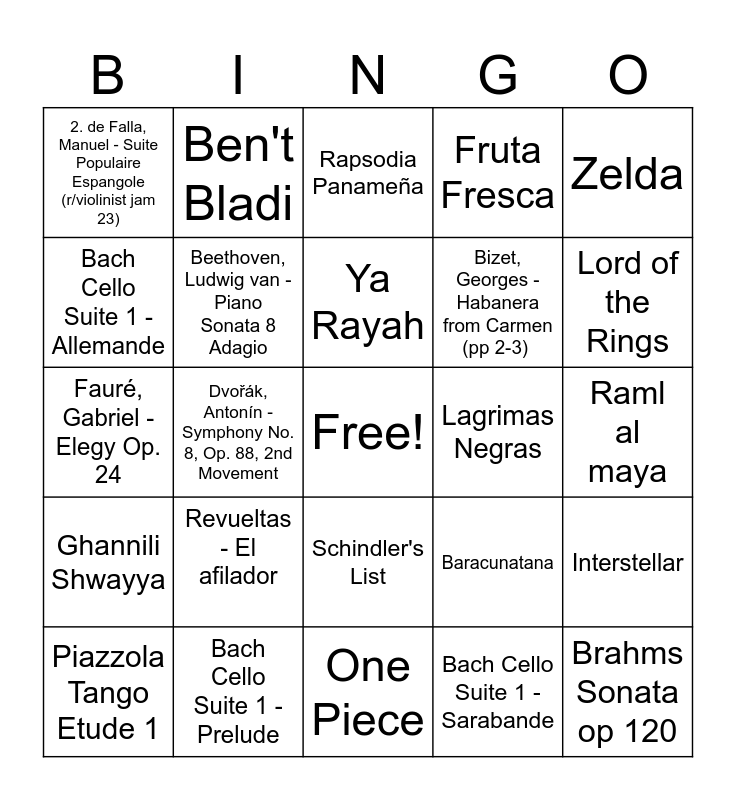This bingo card has a free space and 24 words: Revueltas - El afilador, Bach Cello Suite 1 - Prelude, Ya Rayah, Piazzola Tango Etude 1, Zelda, 2. de Falla, Manuel - Suite Populaire Espangole (r/violinist jam 23), Bach Cello Suite 1 - Allemande, Ben't Bladi, Lagrimas Negras, Schindler's List, Bizet, Georges - Habanera from Carmen (pp 2-3), Fauré, Gabriel - Elegy Op. 24, Baracunatana, Interstellar, Beethoven, Ludwig van - Piano Sonata 8 Adagio, Bach Cello Suite 1 - Sarabande, Raml al maya, Rapsodia Panameña, Lord of the Rings, Dvořák, Antonín - Symphony No. 8, Op. 88, 2nd Movement, Brahms Sonata op 120, Ghannili Shwayya, Fruta Fresca and One Piece.