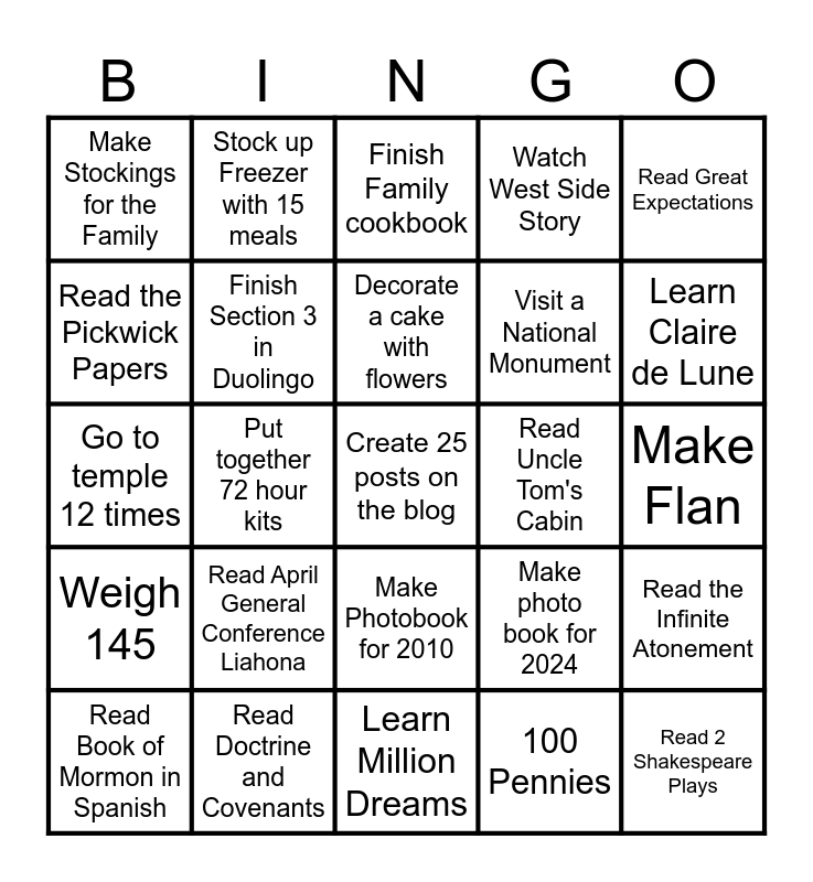 This bingo card has 25 words: Read April General Conference Liahona, Learn Million Dreams, Decorate a cake with flowers, Read Book of Mormon in Spanish, Read Great Expectations, Make Stockings for the Family, Read the Pickwick Papers, Stock up Freezer with 15 meals, Read Uncle Tom's Cabin, Make Photobook for 2010, Visit a National Monument, Go to temple 12 times, Make photo book for 2024, Read the Infinite Atonement, Finish Section 3 in Duolingo, Read 2 Shakespeare Plays, Make Flan, Finish Family cookbook, Learn Claire de Lune, Put together 72 hour kits, Create 25 posts on the blog, Read Doctrine and Covenants, Weigh 145, Watch West Side Story and 100 Pennies.