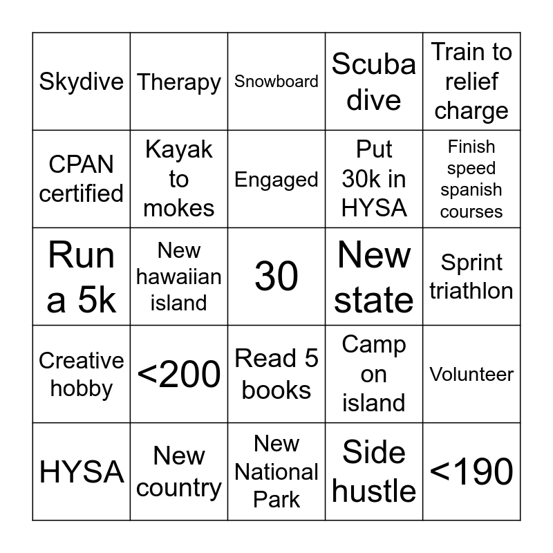 This bingo card has a free space and 24 words: <200, New country, Engaged, HYSA, Train to relief charge, Skydive, CPAN certified, Therapy, New state, Read 5 books, Put 30k in HYSA, Run a 5k, Camp on island, Volunteer, Kayak to mokes, Side hustle, Sprint triathlon, Snowboard, Finish speed spanish courses, New hawaiian island, <190, Creative hobby, Scuba dive and New National Park.