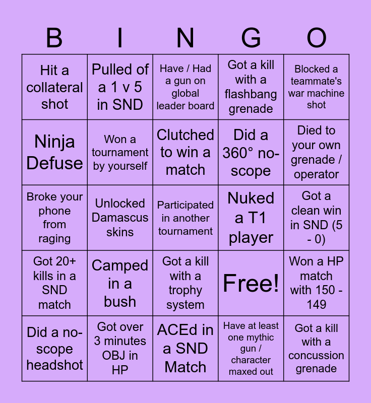 This bingo card has 25 words: Camped in a bush, ACEd in a SND Match, Clutched to win a match, Did a no-scope headshot, Blocked a teammate's war machine shot, Hit a collateral shot, Ninja Defuse, Pulled of a 1 v 5 in SND, Nuked a T1 player, Got a kill with a trophy system, Did a 360° no-scope, Broke your phone from raging, Free!, Won a HP match with 150 - 149, Won a tournament by yourself, Got a kill with a concussion grenade, Got a clean win in SND (5 - 0), Have / Had a gun on global leader board, Died to your own grenade / operator, Unlocked Damascus skins, Participated in another tournament, Got over 3 minutes OBJ in HP, Got 20+ kills in a SND match, Got a kill with a flashbang grenade and Have at least one mythic gun / character maxed out.
