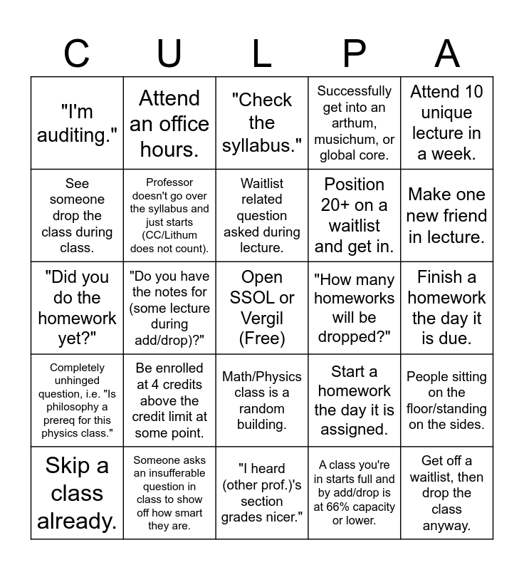 This bingo card has a free space and 24 words: Be enrolled at 4 credits above the credit limit at some point., Someone asks an insufferable question in class to show off how smart they are., Waitlist related question asked during lecture., Skip a class already., Attend 10 unique lecture in a week., "I'm auditing.", See someone drop the class during class., Attend an office hours., "How many homeworks will be dropped?", Math/Physics class is a random building., Position 20+ on a waitlist and get in., "Did you do the homework yet?", Start a homework the day it is assigned., People sitting on the floor/standing on the sides., Professor doesn't go over the syllabus and just starts (CC/Lithum does not count)., A class you're in starts full and by add/drop is at 66% capacity or lower., Finish a homework the day it is due., "Check the syllabus.", Make one new friend in lecture., "Do you have the notes for (some lecture during add/drop)?", Get off a waitlist, then drop the class anyway., Completely unhinged question, i.e. "Is philosophy a prereq for this physics class.", Successfully get into an arthum, musichum, or global core. and "I heard (other prof.)'s section grades nicer.".