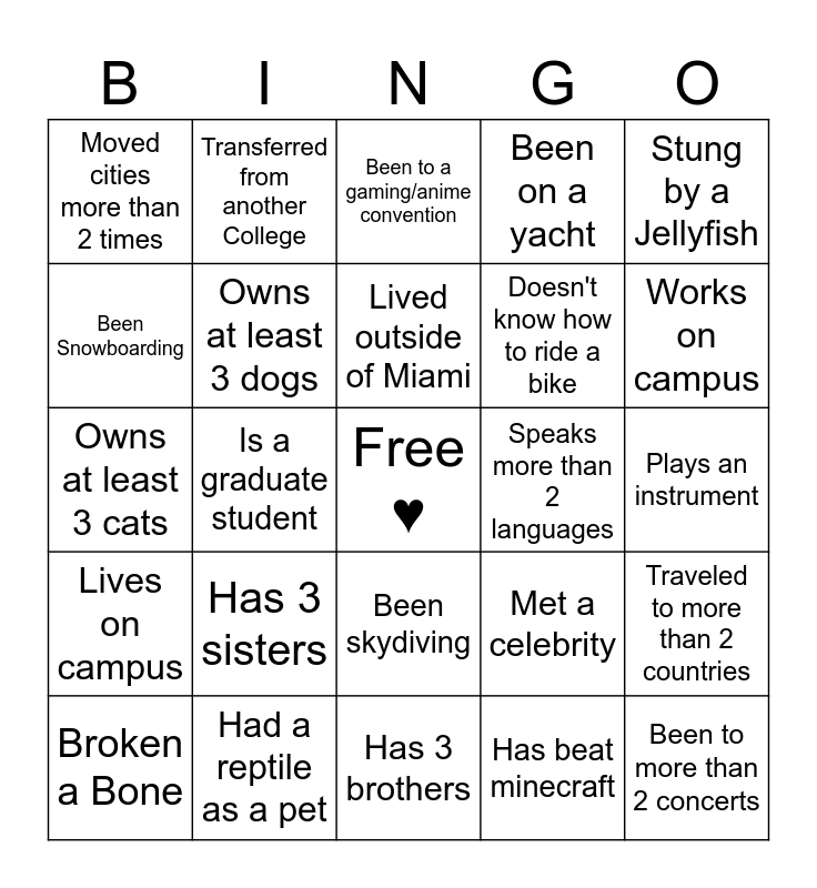This bingo card has a free space and 24 words: Has 3 sisters, Had a reptile as a pet, Lived outside of Miami, Broken a Bone, Stung by a Jellyfish, Moved cities more than 2 times, Been Snowboarding, Transferred from another College, Speaks more than 2 languages, Been skydiving, Doesn't know how to ride a bike, Owns at least 3 cats, Met a celebrity, Traveled to more than 2 countries, Owns at least 3 dogs, Has beat minecraft, Plays an instrument, Been to a gaming/anime convention, Works on campus, Is a graduate student, Been to more than 2 concerts, Lives on campus, Been on a yacht and Has 3 brothers.