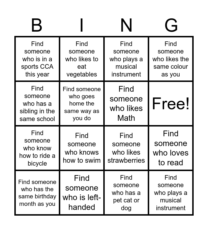 This bingo card has 17 words: Find someone who has a pet cat or dog, Find someone who has the same birthday month as you, Find someone who plays a musical instrument, Find someone who is in a sports CCA this year, Find someone who knows how to swim, Find someone who likes the same colour as you, Find someone who loves to read, Find someone who likes Math, Free!, Find someone who goes home the same way as you do, Find someone who is left-handed, Find someone who likes strawberries, Find someone who has a sibling in the same school, Find someone who likes to eat vegetables, Find someone who know how to ride a bicycle, Find someone who does not like to eat pizza and Find someone who plays a musical instrument.