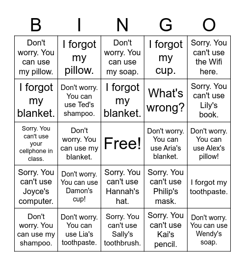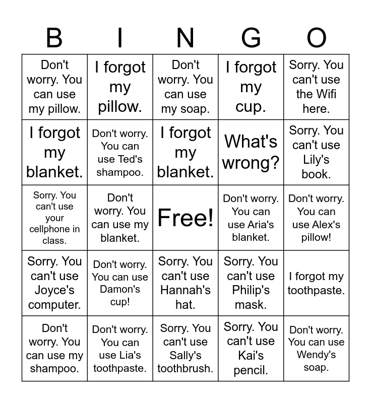 This bingo card has a free space and 29 words: Don't worry. You can use my shampoo., Don't worry. You can use my cup., Don't worry. You can use my blanket., Don't worry. You can use my toothpaste., Don't worry. You can use my pillow., Don't worry. You can use my soap., Don't worry. You can use Ted's shampoo., Don't worry. You can use Damon's cup!, Don't worry. You can use Aria's blanket., Don't worry. You can use Lia's toothpaste., Don't worry. You can use Alex's pillow!, Don't worry. You can use Wendy's soap., Sorry. You can't use Sally's toothbrush., Sorry. You can't use Kai's pencil., Sorry. You can't use Lily's book., Sorry. You can't use Alex's glasses., Sorry. You can't use Hannah's hat., Sorry. You can't use Joyce's computer., Sorry. You can't use the Wifi here., Sorry. You can't use your cellphone in class., Sorry. You can't use Philip's mask., Sorry. You can't use Damon's teddy bear., What's wrong?, I forgot my blanket., I forgot my cup., I forgot my pillow., I forgot my toothpaste., I forgot my blanket. and I forgot my soap..