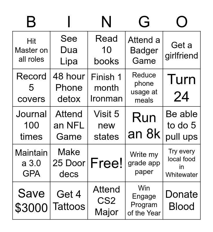 This bingo card has 26 words: Free!, Win Engage Program of the Year, Finish 1 month Ironman, Get 4 Tattoos, Get a girlfriend, Hit Master on all roles, Record 5 covers, See Dua Lipa, Be able to do 5 pull ups, Write my grade app paper, Reduce phone usage at meals, Journal 100 times, Try every local food in Whitewater, Save $3000, Attend an NFL Game, Bench 225, Attend a Badger Game, Maintain a 3.0 GPA, Read 10 books, Visit 5 new states, Turn 24, Attend CS2 Major, Run an 8k, Make 25 Door decs, 48 hour Phone detox and Donate Blood.