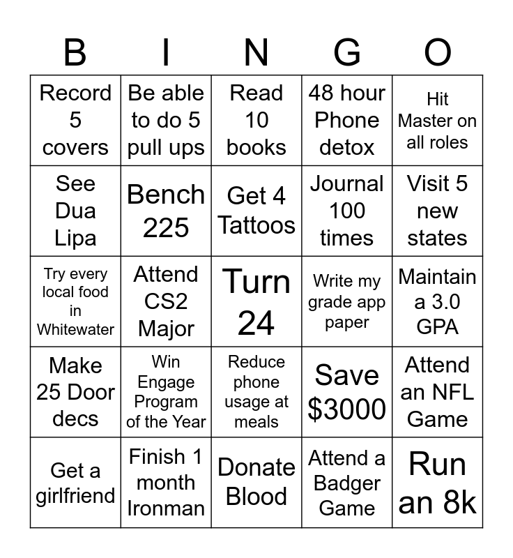This bingo card has a free space and 24 words: Win Engage Program of the Year, Finish 1 month Ironman, Get 4 Tattoos, Get a girlfriend, Hit Master on all roles, Record 5 covers, See Dua Lipa, Be able to do 5 pull ups, Write my grade app paper, Reduce phone usage at meals, Journal 100 times, Try every local food in Whitewater, Save $3000, Attend an NFL Game, Bench 225, Attend a Badger Game, Maintain a 3.0 GPA, Read 10 books, Visit 5 new states, Attend CS2 Major, Run an 8k, Make 25 Door decs, 48 hour Phone detox and Donate Blood.