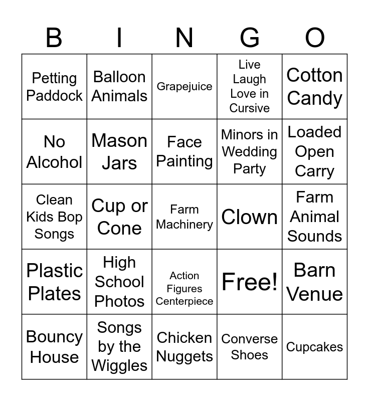 This bingo card has 25 words: High School Photos, Chicken Nuggets, Face Painting, Bouncy House, Cotton Candy, Petting Paddock, No Alcohol, Balloon Animals, Clown, Action Figures Centerpiece, Minors in Wedding Party, Clean Kids Bop Songs, Free!, Barn Venue, Mason Jars, Cupcakes, Farm Animal Sounds, Grapejuice, Loaded Open Carry, Cup or Cone, Farm Machinery, Songs by the Wiggles, Plastic Plates, Live Laugh Love in Cursive and Converse Shoes.