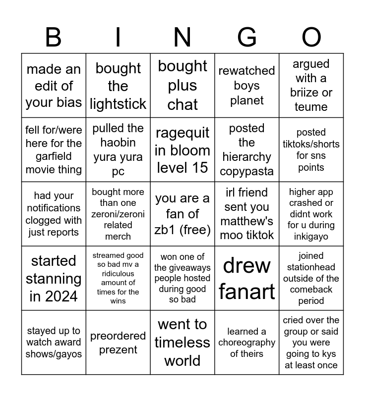 This bingo card has a free space and 24 words: streamed good so bad mv a ridiculous amount of times for the wins, preordered prezent, ragequit in bloom level 15, stayed up to watch award shows/gayos, argued with a briize or teume, made an edit of your bias, fell for/were here for the garfield movie thing, bought the lightstick, irl friend sent you matthew's moo tiktok, won one of the giveaways people hosted during good so bad, posted the hierarchy copypasta, had your notifications clogged with just reports, drew fanart, joined stationhead outside of the comeback period, pulled the haobin yura yura pc, learned a choreography of theirs, higher app crashed or didnt work for u during inkigayo, bought plus chat, posted tiktoks/shorts for sns points, bought more than one zeroni/zeroni related merch, cried over the group or said you were going to kys at least once, started stanning in 2024, rewatched boys planet and went to timeless world.