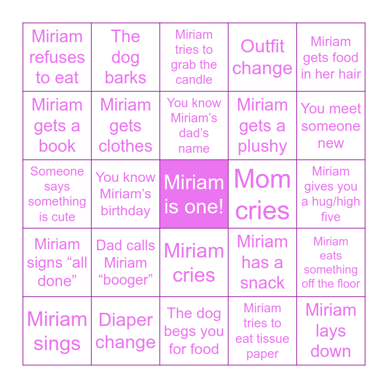 This bingo card has a free space and 45 words: Miriam falls, Miriam lays down, Miriam dances, Miriam sings, Miriam laughs, Miriam tries to eat tissue paper, Miriam tries to grab the candle, Miriam feeds the dog, Miriam gets food in her hair, Diaper change, Outfit change, Mom cries, Miriam cries, Dad calls Miriam “booger”, Mom calls Miriam “goose”, The dog begs you for food, Someone says “she grew up so fast”, Someone says something is cute, Someone comments on Miriam’s belly, You meet someone new, The dog barks, Mom can’t find dad, Dad can’t find mom, Miriam refuses to eat, Miriam grabs something she can’t have, Miriam gives you a hug/high five, Miriam has paci, Miriam has bamboo, Miriam has a snack, Miriam signs “all done”, Miriam signs “more”, Miriam eats something off the floor, A drink is spilled, You hear a song you know, Someone asks about Miriam’s helmet, You know Miriam’s birthday, You know Miriam’s middle name, You know where Miriam was born, You know Miriam’s mom’s name, You know Miriam’s dad’s name, Miriam gets a book, Miriam gets a plushy, Miriam gets a toy, Miriam gets clothes and You get a photo with Miriam.