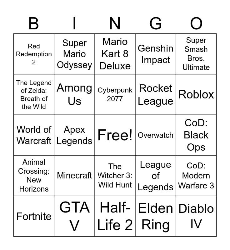 This bingo card has a free space and 24 words: Minecraft, GTA V, Cyberpunk 2077, Fortnite, Super Smash Bros. Ultimate, Red Redemption 2, The Legend of Zelda: Breath of the Wild, Super Mario Odyssey, Overwatch, The Witcher 3: Wild Hunt, Rocket League, World of Warcraft, League of Legends, CoD: Modern Warfare 3, Among Us, Elden Ring, CoD: Black Ops, Mario Kart 8 Deluxe, Roblox, Apex Legends, Diablo IV, Animal Crossing: New Horizons, Genshin Impact and Half-Life 2.