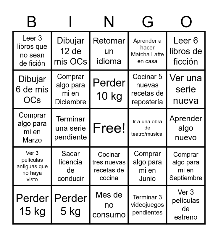 This bingo card has a free space and 24 words: Sacar licencia de conducir, Perder 5 kg, Perder 10 kg, Perder 15 kg, Leer 6 libros de ficción, Leer 3 libros que no sean de fición, Dibujar 6 de mis OCs, Dibujar 12 de mis OCs, Ir a una obra de teatro/musical, Cocinar tres nuevas recetas de cocina, Cocinar 5 nuevas recetas de repostería, Comprar algo para mi en Marzo, Comprar algo para mi en Junio, Comprar algo para mi en Septiembre, Comprar algo para mi en Diciembre, Terminar 3 videojuegos pendientes, Aprender algo nuevo, Retomar un idioma, Ver una serie nueva, Terminar una serie pendiente, Ver 3 películas de estreno, Ver 3 películas antiguas que no haya visto, Aprender a hacer Matcha Latte en casa and Mes de no consumo.