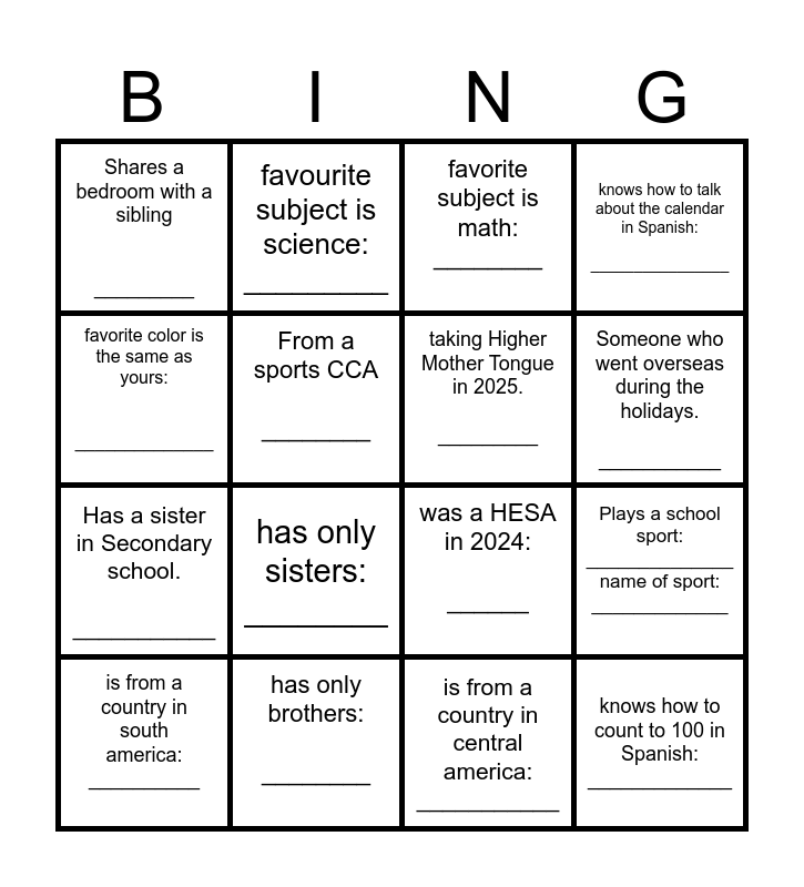 This bingo card has 25 words: favourite fast food is KFC __________, has a surname with 3 alphabets. _____________, Someone who went overseas during the holidays. ___________, has either a pet dog or a cat: _____________, favorite color is the same as yours: ______________, Shares a bedroom with a sibling _________, From a sports CCA ________, favourite subject is science: _________, has only brothers: ________, favourite subject is English: _________, Has a sister in Secondary school. ___________, was a HESA in 2024: ______, Someone who walks to school. _________, Has a red pencil case __________, taking Higher Mother Tongue in 2025. _________, Someone who is at least 160cm tall. _________, is from a country in central america: ___________, favorite subject is math: ________, has only sisters: ________, Plays a school sport: ______________ name of sport: _____________, is from a country in south america: __________, knows how to talk about the weather in Spanish: _______________, knows how to count to 100 in Spanish: _____________, knows how to talk about the calendar in Spanish: ________________ and knows how to greet, introduce themselves and say goodbye in Spanish: ______________.