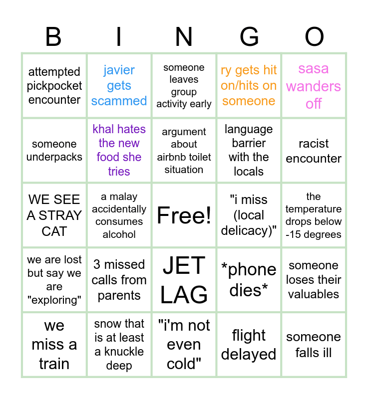This bingo card has a free space and 24 words: 3 missed calls from parents, snow that is at least a knuckle deep, argument about airbnb toilet situation, we miss a train, sasa wanders off, attempted pickpocket encounter, someone underpacks, javier gets scammed, "i miss (local delicacy)", JET LAG, language barrier with the locals, WE SEE A STRAY CAT, *phone dies*, someone loses their valuables, khal hates the new food she tries, flight delayed, the temperature drops below -15 degrees, someone leaves group activity early, racist encounter, a malay accidentally consumes alcohol, someone falls ill, we are lost but say we are "exploring", ry gets hit on/hits on someone and "i'm not even cold".