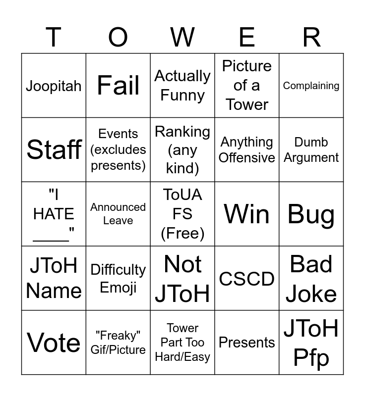 This bingo card has a free space and 24 words: Difficulty Emoji, "Freaky" Gif/Picture, Ranking (any kind), Vote, Complaining, Joopitah, Staff, Fail, Win, Not JToH, Anything Offensive, "I HATE ____", CSCD, Bad Joke, Events (excludes presents), Presents, Bug, Actually Funny, Dumb Argument, Announced Leave, JToH Pfp, JToH Name, Picture of a Tower and Tower Part Too Hard/Easy.