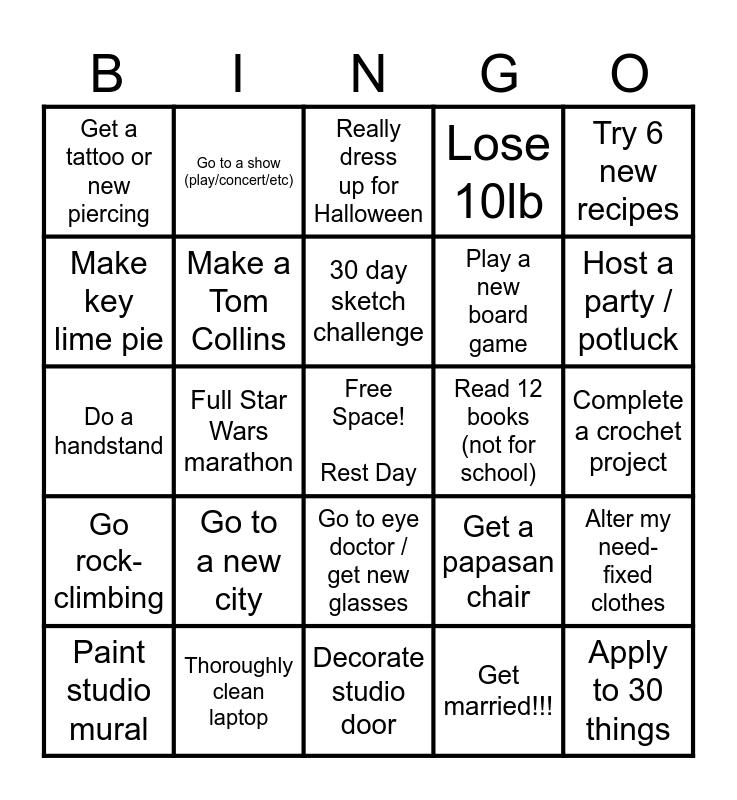 This bingo card has a free space and 24 words: Go to a new city, Thoroughly clean laptop, 30 day sketch challenge, Paint studio mural, Try 6 new recipes, Get a tattoo or new piercing, Make key lime pie, Go to a show (play/concert/etc), Read 12 books (not for school), Go to eye doctor / get new glasses, Play a new board game, Do a handstand, Get a papasan chair, Alter my need-fixed clothes, Make a Tom Collins, Get married!!!, Complete a crochet project, Really dress up for Halloween, Host a party / potluck, Full Star Wars marathon, Apply to 30 things, Go rock-climbing, Lose 10lb and Decorate studio door.