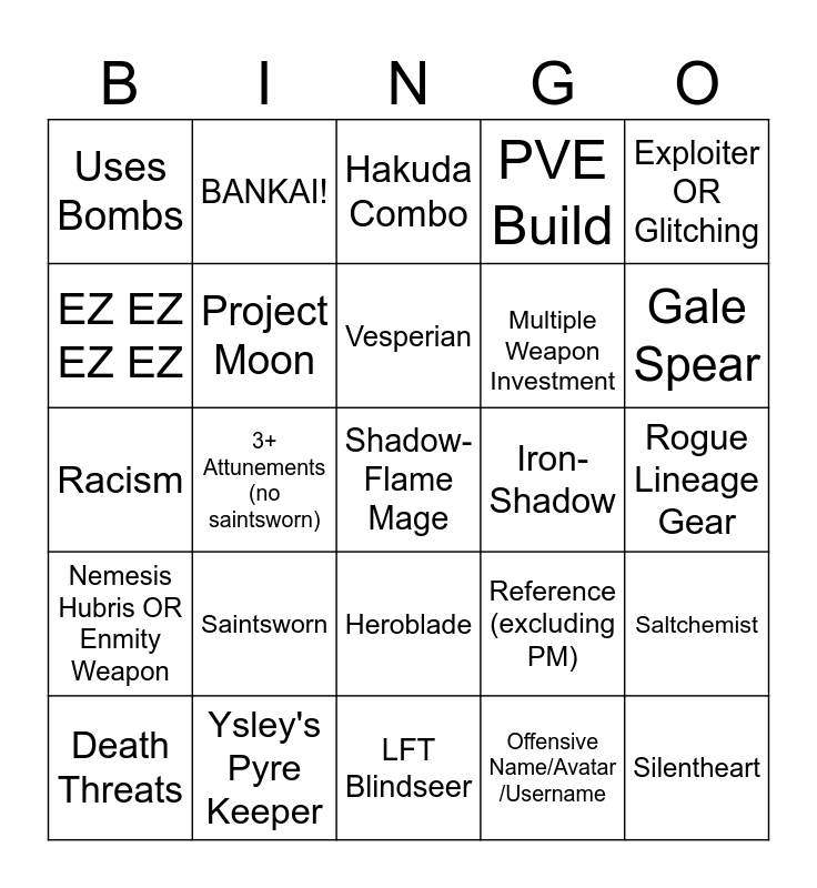 This bingo card has a free space and 24 words: Saintsworn, Ysley's Pyre Keeper, Vesperian, Death Threats, Exploiter OR Glitching, Uses Bombs, EZ EZ EZ EZ, BANKAI!, Iron-Shadow, Heroblade, Multiple Weapon Investment, Racism, Reference (excluding PM), Saltchemist, Project Moon, Offensive Name/Avatar /Username, Rogue Lineage Gear, Hakuda Combo, Gale Spear, 3+ Attunements (no saintsworn), Silentheart, Nemesis Hubris OR Enmity Weapon, PVE Build and LFT Blindseer.