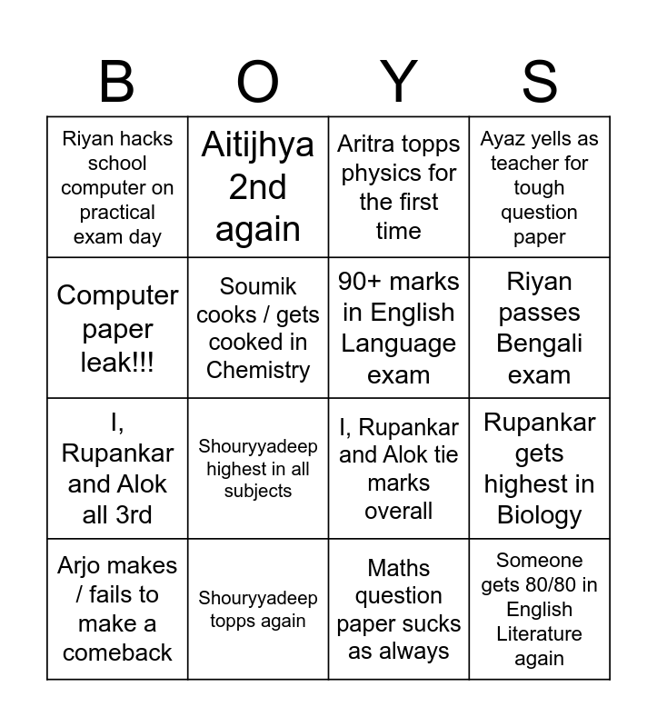 This bingo card has 16 words: Shouryyadeep topps again, Rupankar gets highest in Biology, Aritra topps physics for the first time, Riyan hacks school computer on practical exam day, I, Rupankar and Alok all 3rd, Aitijhya 2nd again, I, Rupankar and Alok tie marks overall, Maths question paper sucks as always, Computer paper leak!!!, Soumik cooks / gets cooked in Chemistry, Arjo makes / fails to make a comeback, Ayaz yells as teacher for tough question paper, Shouryyadeep highest in all subjects, Riyan passes Bengali exam, 90+ marks in English Language exam and Someone gets 80/80 in English Literature again.